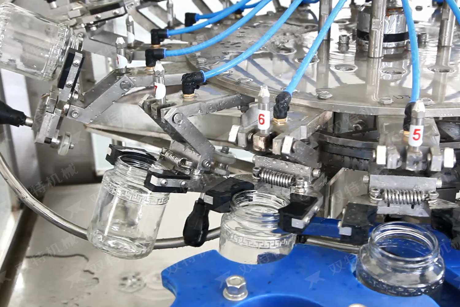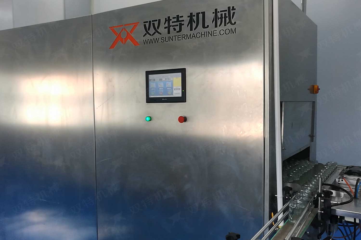 洗瓶機(jī)的過程是空瓶進(jìn)入輸瓶螺桿,由星輪傳動(dòng)到夾瓶工位,洗瓶的整個(gè)過程瓶底均懸空,其優(yōu)點(diǎn)是著力點(diǎn)在瓶頭和頸部,是瓶子厚硬的部分,在清洗過程中不會(huì)損傷或壓扁,洗瓶機(jī)可調(diào)整多種瓶子,且調(diào)整簡便。