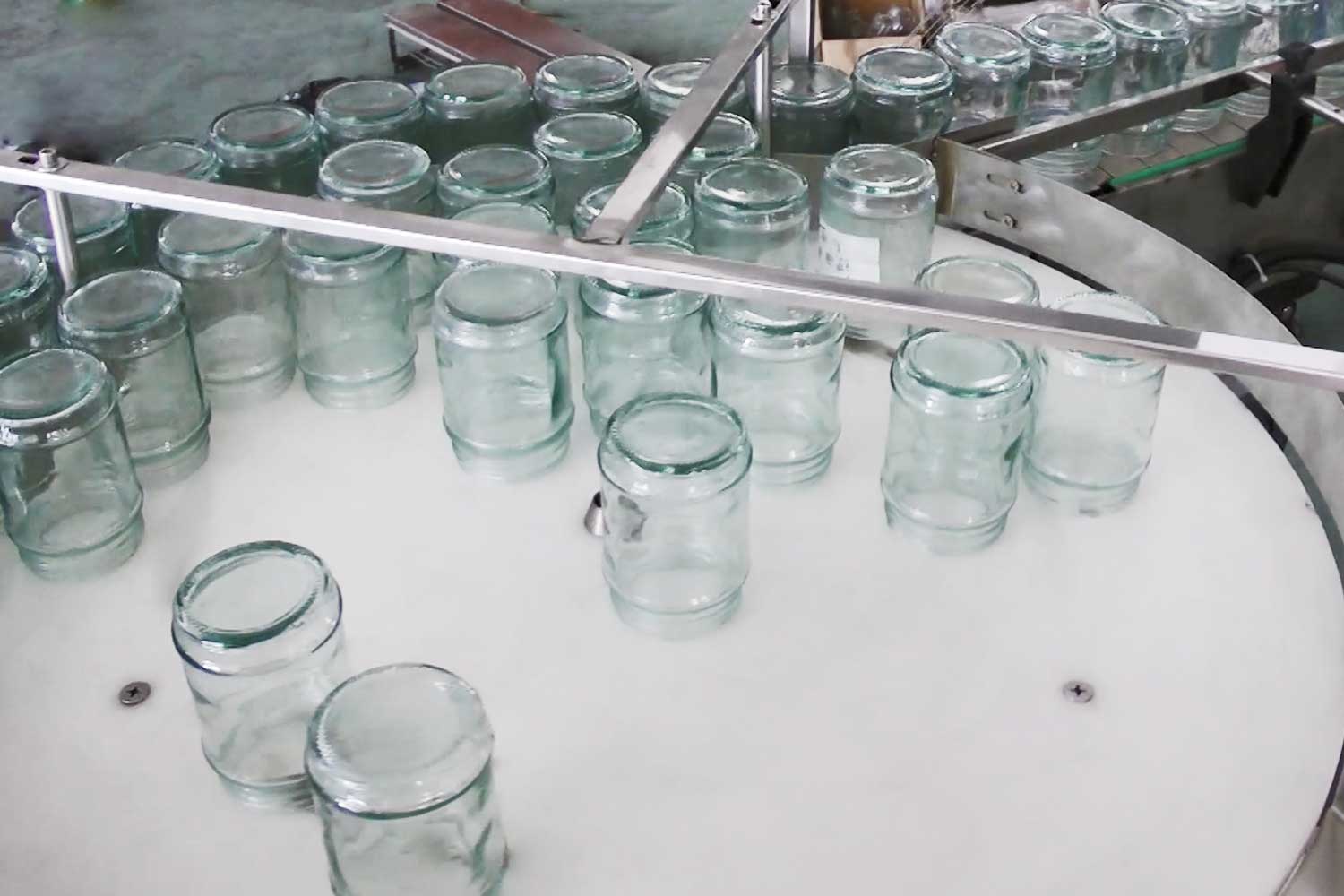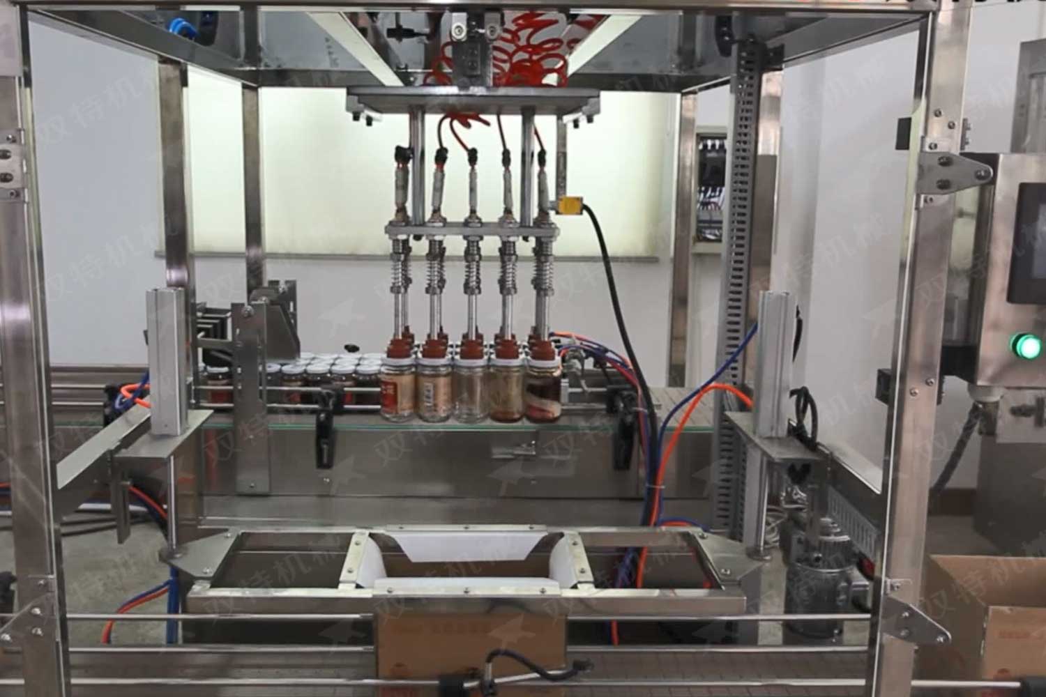 旋蓋機(jī)主要用于玻璃廣口瓶的三、四、六鐵蓋真空旋蓋,用兩根不同速度的皮帶壓瓶蓋,因兩根皮帶的速度不同,對(duì)蓋進(jìn)行搓蓋收緊達(dá)到旋蓋目的。在自動(dòng)上蓋之前對(duì)瓶口吹蒸汽加熱,吹掉冷空氣,換上高溫蒸汽,立即旋蓋,根據(jù)熱脹冷縮原理,蒸汽冷下來就自然形成了瓶內(nèi)真空,達(dá)到了真空旋蓋的目的。自動(dòng)旋蓋機(jī)可以和濃醬灌裝機(jī)、蜂蜜灌裝機(jī)、辣椒醬灌裝機(jī)組合在一起,形成一套全自動(dòng)灌裝設(shè)備,是現(xiàn)代調(diào)味品企業(yè)的得力幫手。